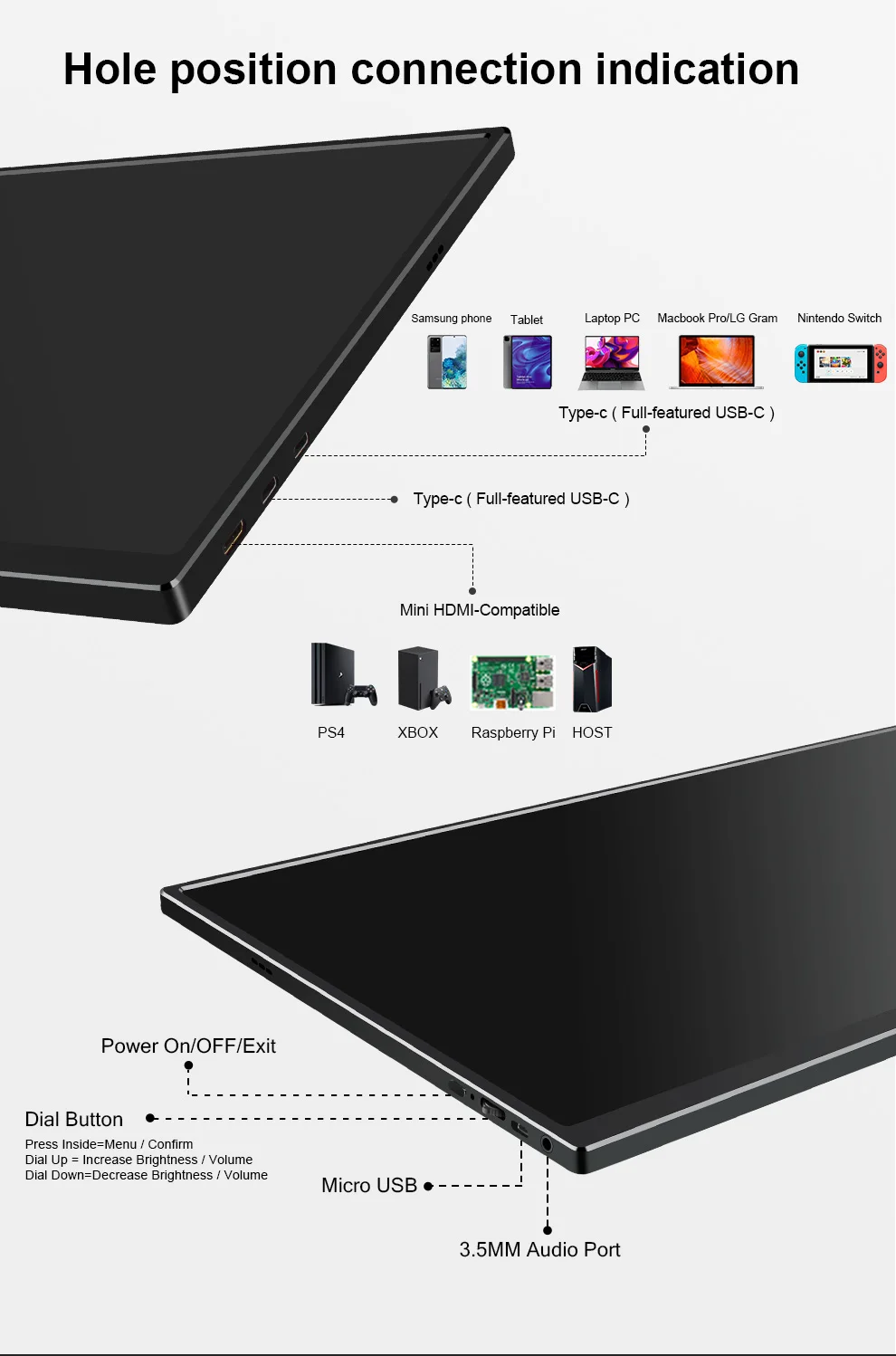 A: All these devices are connected with monitor via HDMI-compatible connection. First: power by the monitor with the charger included(connect the type c pd port); Second, Mini HDMI-compatible to HDMI-compatible cable to connect the device and monitor.